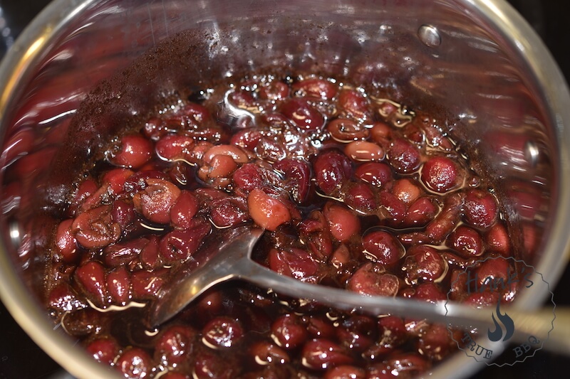 - Om chutneyn efter att ha kokat ihop fortfarande är lite vattnig kan man hälla av lite vätska. Det beror på körsbären, en del släpper mycket vätska, och andra inte så mycket. Samma sak gäller om chutneyn är lite tjock, tillsätt bara en skvätt vatten.